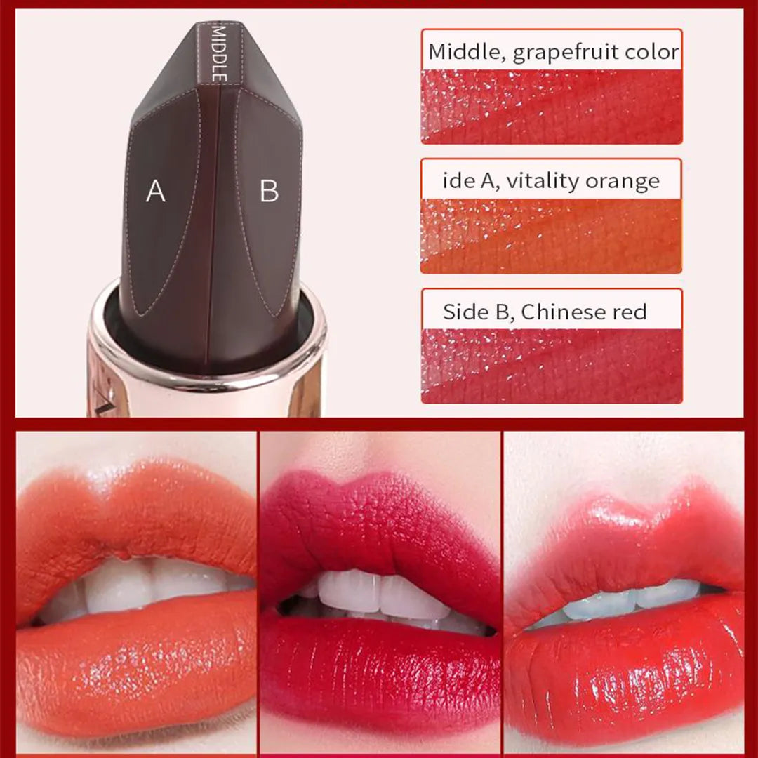 Produkt zawiera trzy niezależne powierzchnie barwiące — A, B i środkową — co pozwala jednym ruchem zmieniać kolor, dopasowując makijaż do stylizacji lub okazji. Dzięki temu jedna pomadka zastępuje kilka klasycznych produktów.