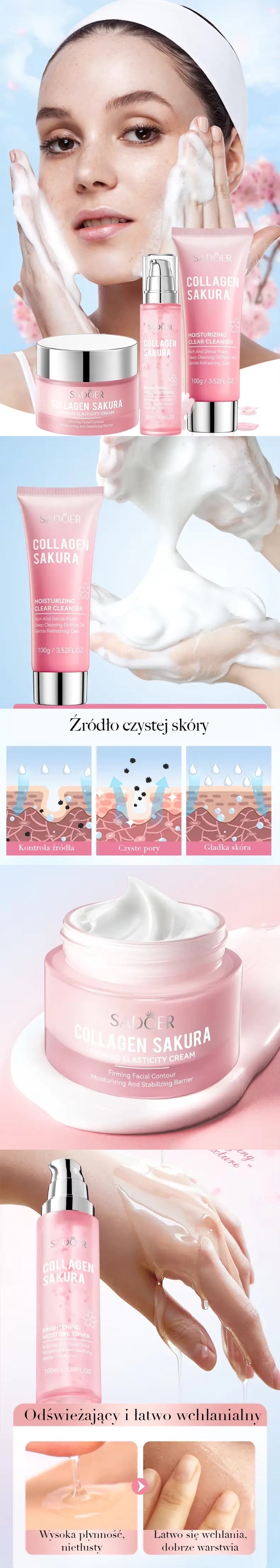 Sada SADOER Collagen Sakura nabízí celé spektrum péče o pleť. Poskytuje nejen hloubkové čištění, ale také hydrataci a ochranu před vnějšími faktory. Produkty jsou ideální pro všechny typy pleti, poskytují intenzivní péči, regeneraci a udržují ji v perfektní kondici každý den.