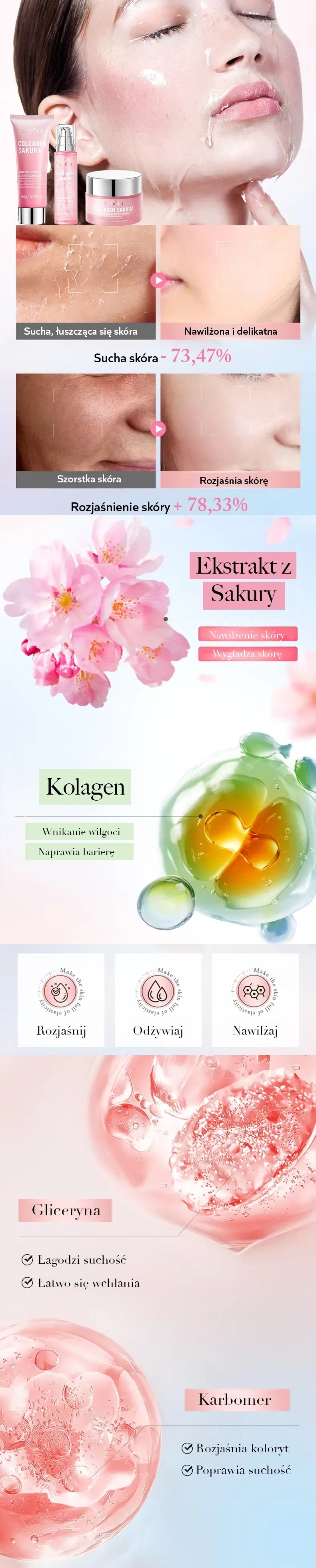 Sada SADOER Collagen Sakura byla speciálně navržena pro intenzivní hydrataci a regeneraci pokožky. Kolagen a extrakt ze sakury spolupracují na hlubokém nasycení pokožky vlhkostí a zabraňují jejímu vysoušení. Pravidelné používání vytváří bariéru, která chrání před dehydratací po celý den.