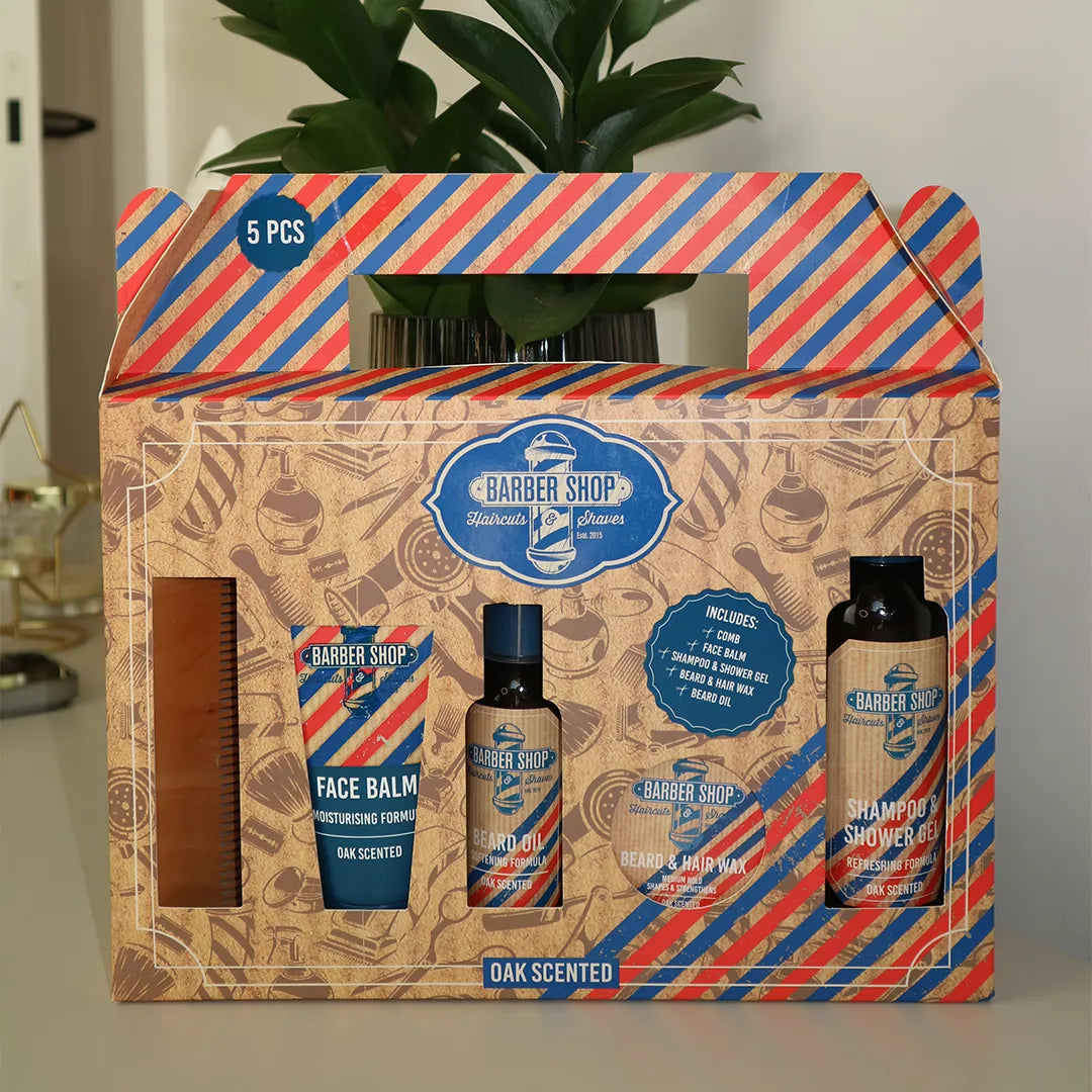 Sada je zabalena ve stylové krabičce ve stylu holičství, která okamžitě udělá dojem. Živé barvy, moderní design a praktické ucho dodávají tomuto dárku drahý a jedinečný vzhled – je připraven k darování bez dalšího balení.