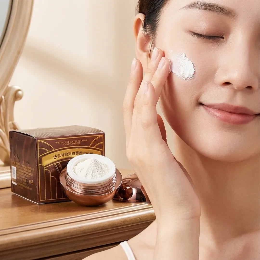 Wybielający krem do twarzy w złotej kuli wspiera równy koloryt skóry i pomaga redukować przebarwienia, pozostawiając jedwabiste wykończenie.