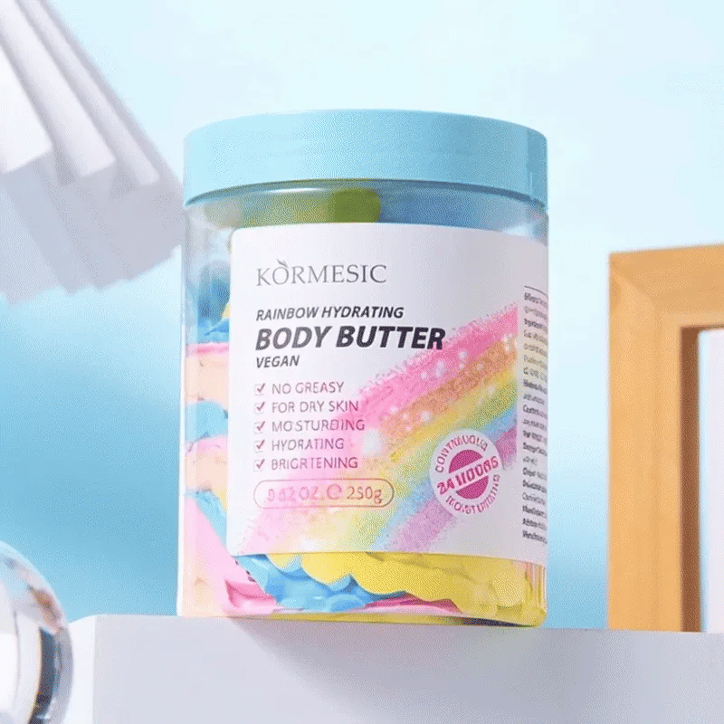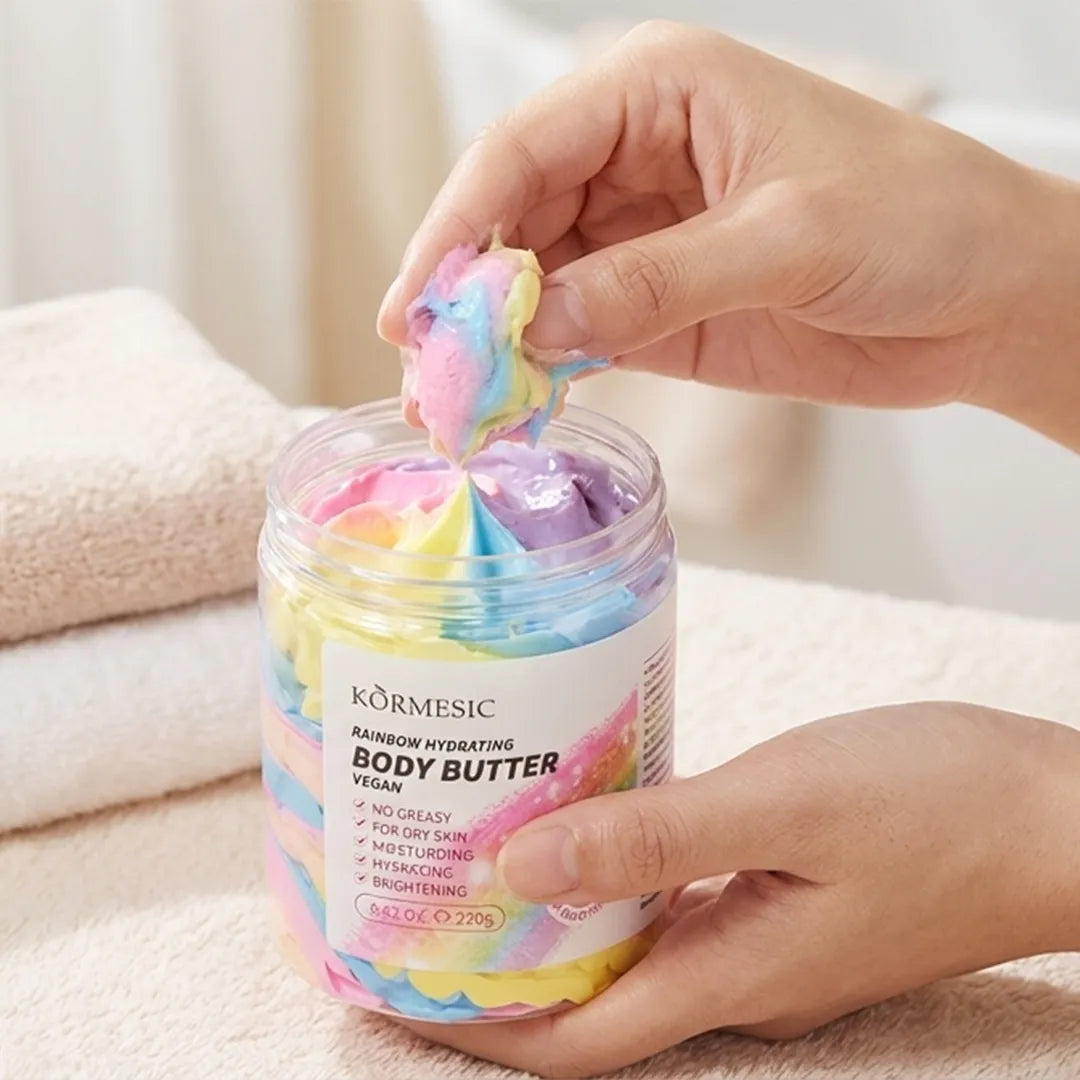 Nawilżające masło do ciała Kormesic Rainbow Hydrating Body Butter zapewnia intensywne zmiękczenie i wygładzenie skóry, jednocześnie szybko się wchłaniając bez pozostawiania tłustej warstwy.