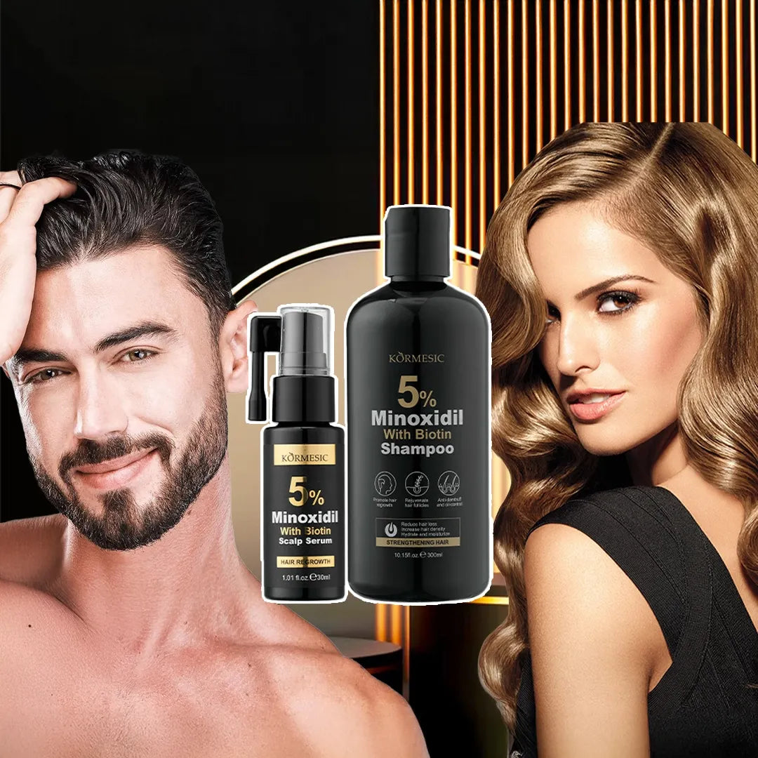 Šampūno ir serumo rinkinys su 5 % minoksidilu ir biotinu yra veiksminga priemonė, kuri vienu metu veikia plaukų slinkimo priežastis ir pasekmes. Dėl abiejų produktų sinergijos jis stabdo plaukų slinkimą jau nuo pirmųjų naudojimo dienų.
