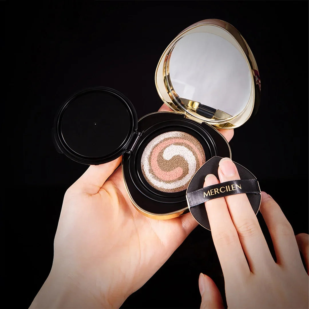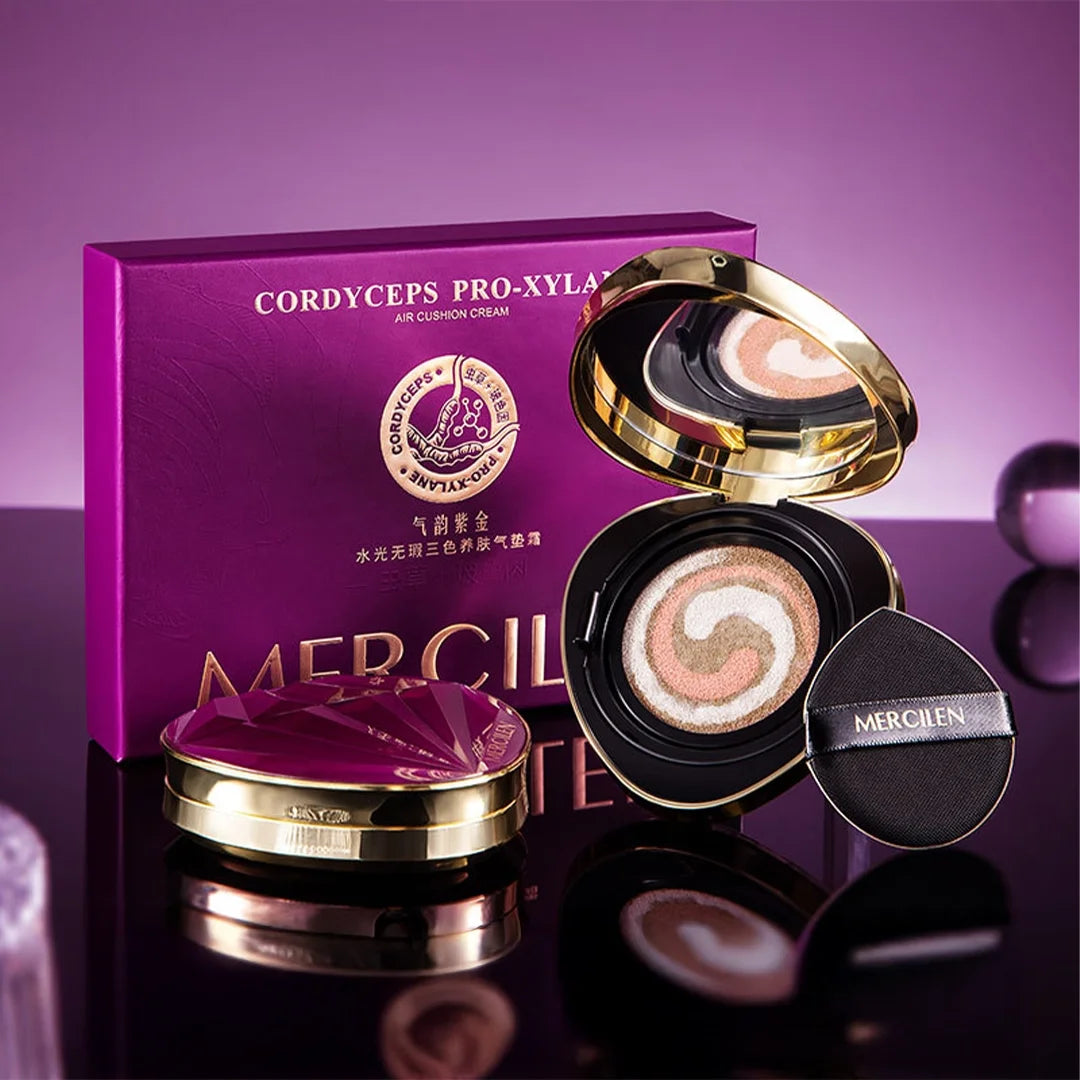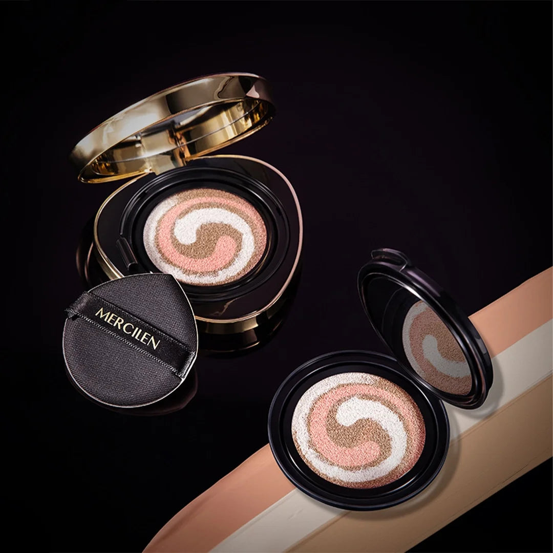 Luksusowy podkład w formie cushion 3w1, który łączy działanie nawilżającego kremu, bazy i rozświetlacza w jednym. Innowacyjna formuła z ekstraktem z kordycepsu i roślinnymi składnikami pielęgnuje cerę, nadając jej nieskazitelny wygląd. Unikalna trójkolorowa struktura wyrównuje koloryt, maskuje niedoskonałości i zapewnia naturalny blask.