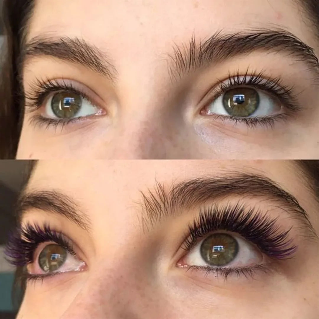 Na zdjęciach widoczna jest wyraźna różnica: naturalne, proste rzęsy „przed” oraz uniesione, mocniej podkręcone i optycznie dłuższe „po”. Efekt jest naturalny, ale jednocześnie bardzo wyrazisty.
