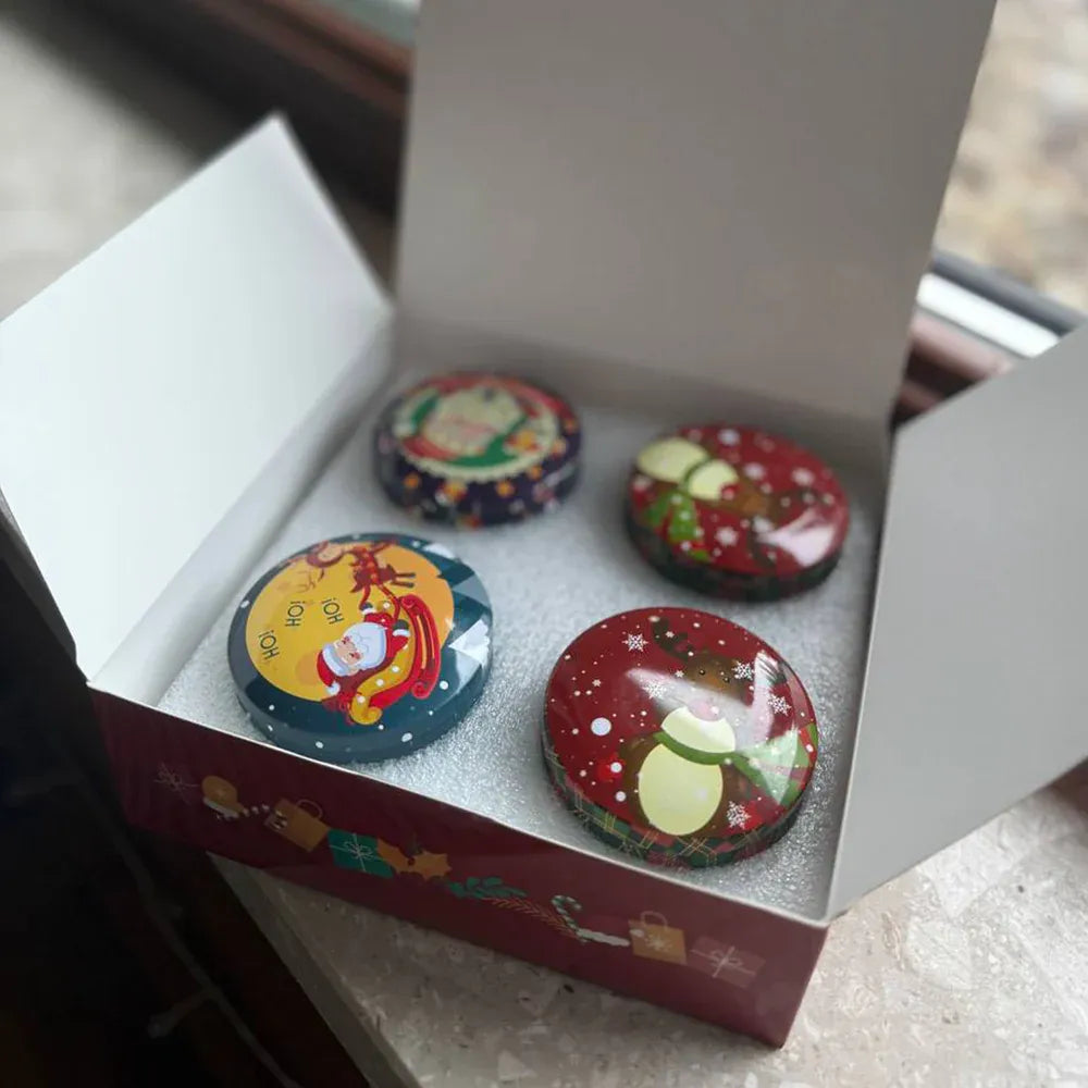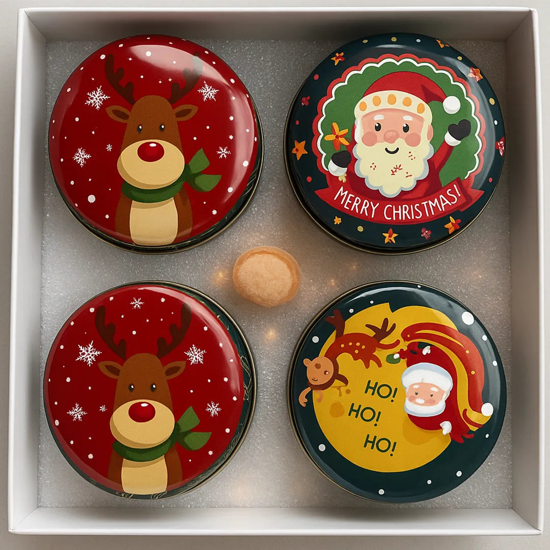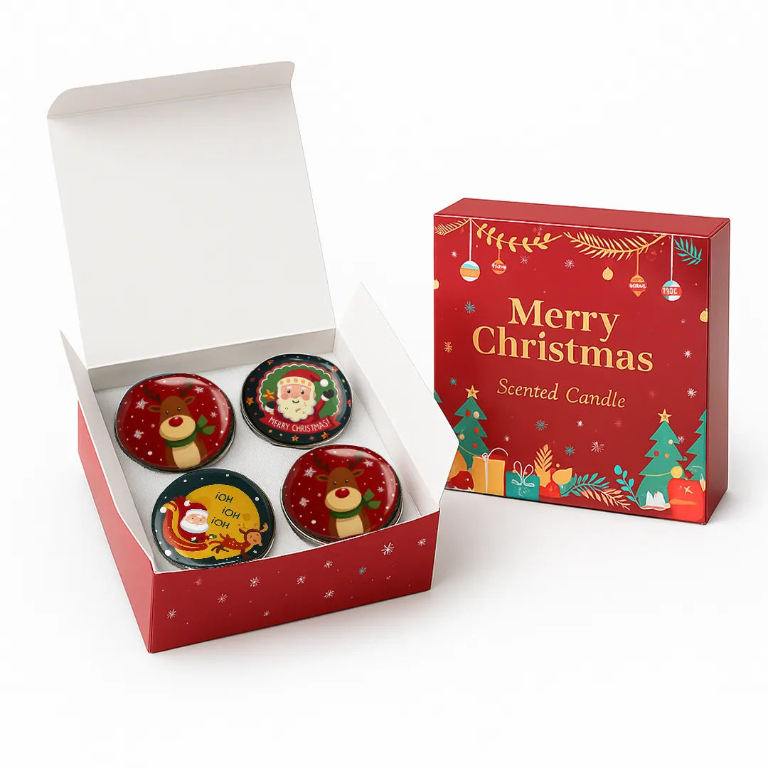 Zestaw obejmuje cztery urocze świeczki w metalowych puszkach o świątecznych motywach: z Mikołajem, reniferem, choinką i piernikiem. Każda świeca ma inny zapach – od słodkiej wanilii, przez lawendę i różę, po drzewo sandałowe – tworząc przyjemny, relaksujący klimat.