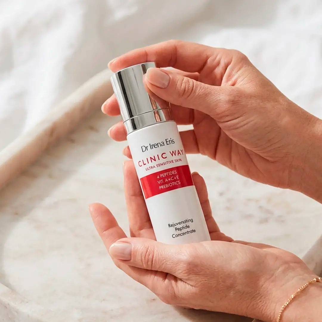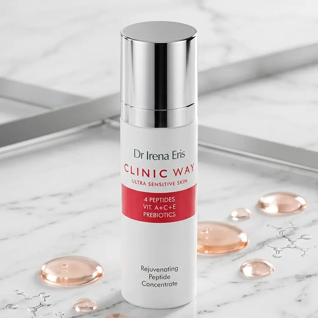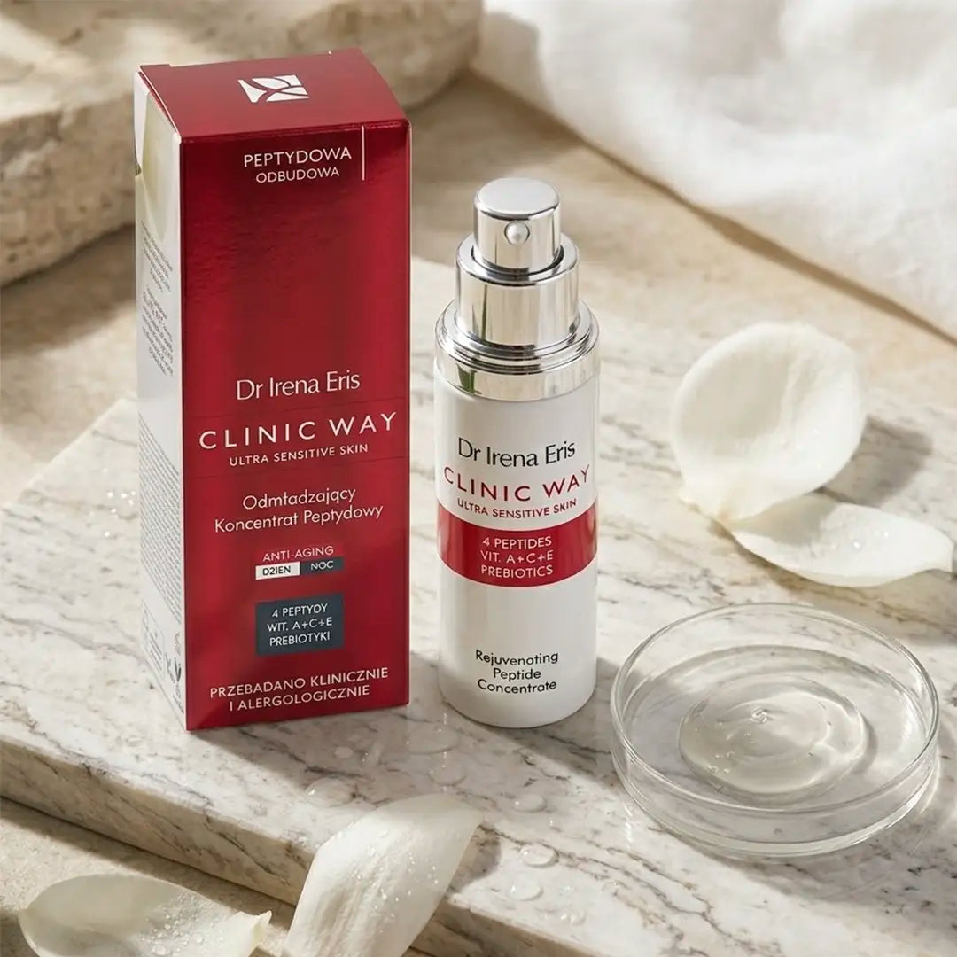 Zastavte procesy starnutia a objavte tajomstvo mladistvej, žiarivej pleti s Omladzujúcim Peptidovým Koncentrátom Dr Irena Eris Clinic Way. Tento pokročilý dermokozmetický prípravok bol vytvorený na účinný boj s viditeľnými známkami plynutia času. Vysoko koncentrovaná formula založená na silnom účinku peptidov stimuluje prirodzenú produkciu kolagénu, viditeľne vyhladzuje vrásky a navracia pokožke stratenú pevnosť. Prídavok kyseliny hyalurónovej zaručuje hlbokú, okamžitú hydratáciu, ktorá zanecháva tvár jemnú a vypnutú. Ľahká, nemastná konzistencia séra sa rýchlo vstrebáva, znižuje pigmentové škvrny a obnovuje jednotný tón pleti. Produkt je mimoriadne jemný, bez parabénov a silikónov, vďaka čomu dokonale vyhovuje potrebám aj tej najcitlivejšej a reaktívnej pokožky.